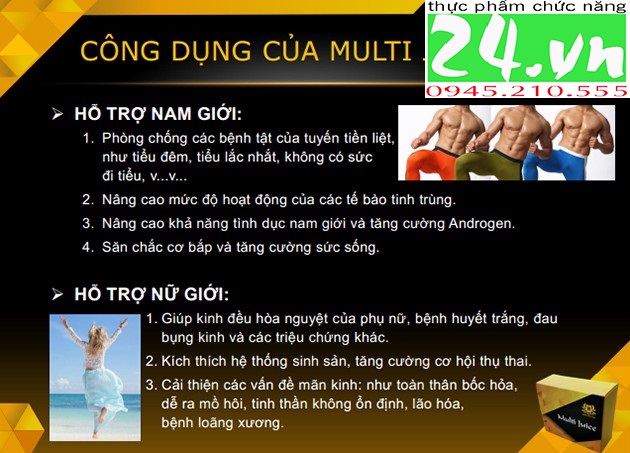 Multi Juice Nước ép tăng cường sức khỏe – Sản phẩm tập trung giải quyết, khắc phục các vấn đề chủ yếu từ sâu bên trong cơ thể, từ đó tăng cường sự dẻo dai tăng ham muốn tình dục kéo dài thời gian quan hệ.
