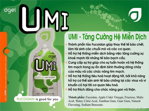 Sản phẩm Agel UMI được chiết xuất từ tảo biển và tinh chất dấm táo có đầy đủ các vitamin và khoáng chất cần thiết cho cơ thể giúp tăng cường hệ miễn dịch, đồng thời hỗ trợ và điều trị cho người bị ung thư và bị tiểu đường, giúp ngăn chặn và hạn chế tối đa các di chứng hoặc biến chứng có thể xảy ra … cung cấp dinh dưỡng phục hồi các chứng năng của các bộ phận bên trong cơ thể, duy trì sức khoẻ cho những người bị bệnh mãn tính và làm tăng tuổi thọ.