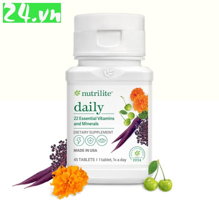 Thực Phẩm Bảo Vệ Sức Khỏe Nutrilite™ Daily Amway, Daily Amway 45 viên là sản phẩm thực phẩm bảo vệ sức khỏe dạng viên nén cung cấp 11 loại vitamin thiết yếu và 10 khoáng chất thiết yếu cho cơ thể. Sản phẩm được sản xuất bởi Amway, một công ty đa quốc gia chuyên về sản phẩm chăm sóc sức khỏe và sắc đẹp.